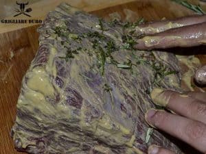 - Preriscaldare il Barbecue a 220 ° e sparare sulla griglia il pezzo di carne posizionandolo lontano dalla fonte di calore (cottura indiretta), per aggiungere un pizzico di sentore di affumicatura possiamo mettere un rametto di rosmarino sulla carbonella.