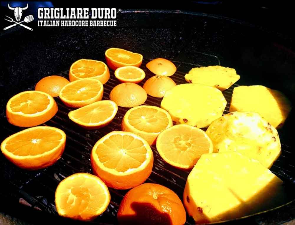 Posizionare le fette di arancia e le fette d’ananas sulle griglie e farle caramellare 5 minuti per lato