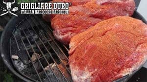 Una volta Condita per bene la coppa e stabilizzato il barbecue siete pronti: GRIGLIATE!Mettete il vostro maialo sulla griglia per una cottura appunto indiretta, se avete difficoltà a stabilizzare la temperatura potete mettere sulla griglia delle braci un water pan ossia una teglia di alluminio con 2 dita d’acqua, questo aiuterà a mantenere una certa umidità nella camera e a non far schizzare la temperatura ma non lasciatela per troppo tempo altrimenti il Bark (ossia la crosticina che si forma tutto attorno ve) ve lo scordate proprio e invece sarà la parte più buona. Una teglia di raccolta succhi andrà comunque messa perchè soprattutto la coppa sbrodoleranno con violenza
